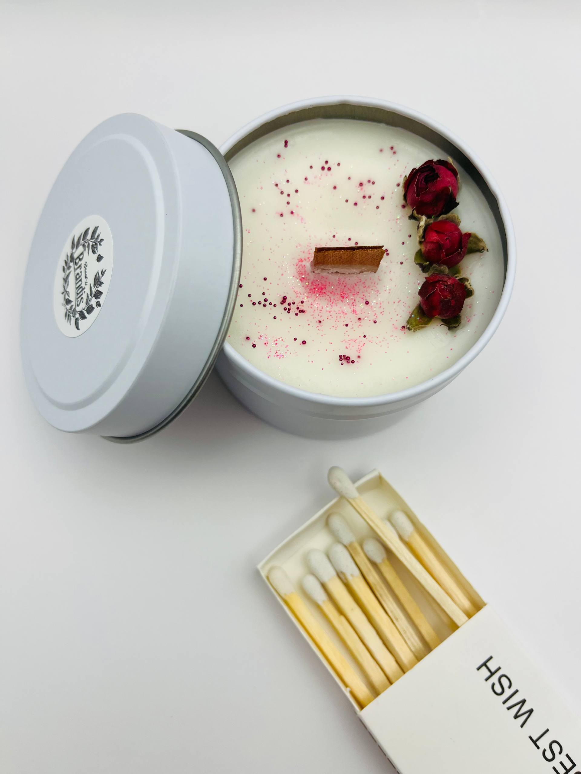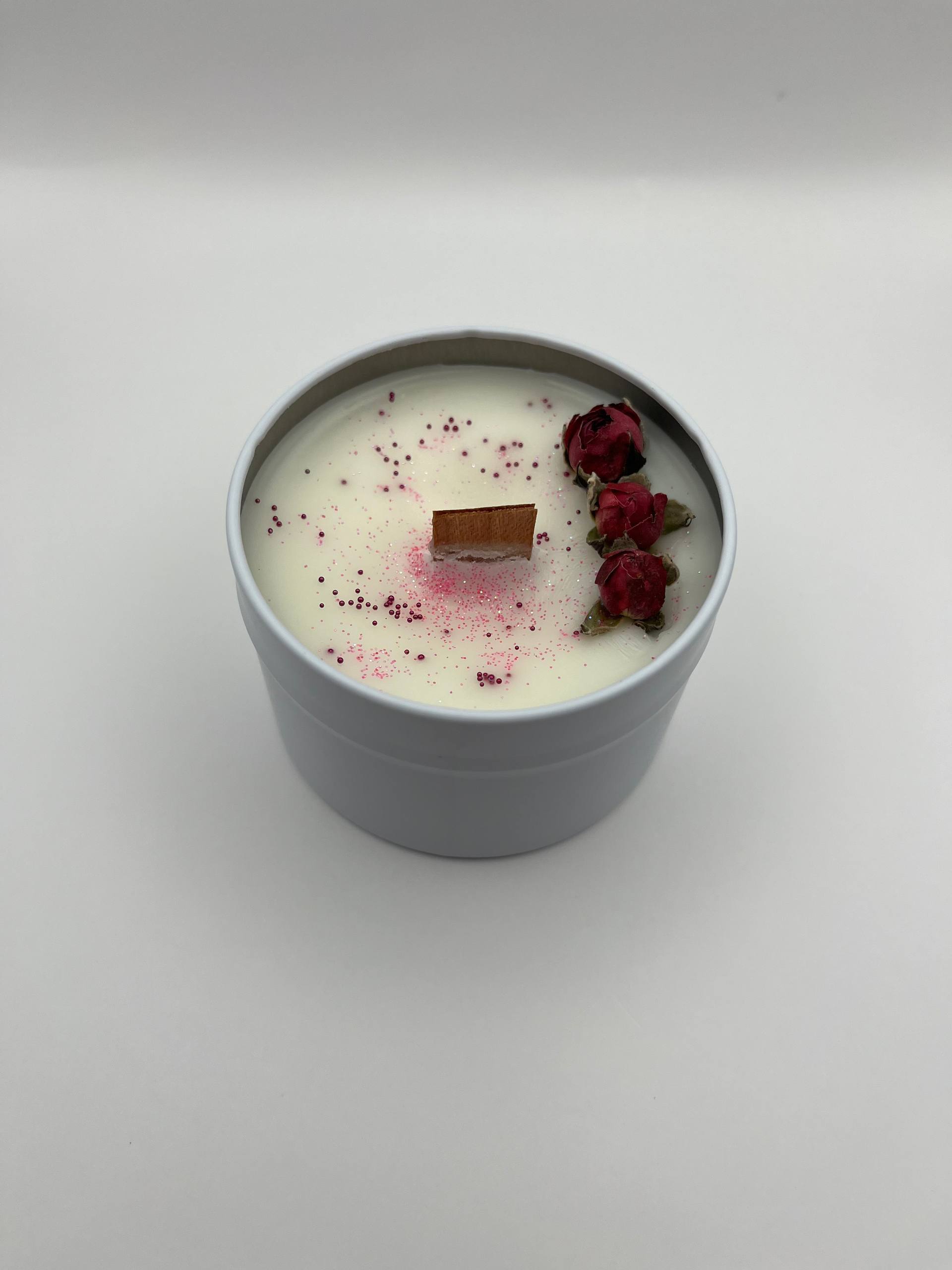 · 💫 Роскошный дизайн: Эта свеча — изысканный подарок. Она исполнена в элегантной белой железной банке с крышкой, а ее поверхность украшена тремя нежными розами и легким мерцанием изящных блёсток. Она прекрасна даже до момента зажигания.